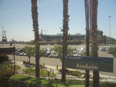 I didn't make it to Dodger Stadium. However, I was able to "visit" the other "Los Angeles" stadium when suddenly the Amtrak train that I was taking from L.A. to San Diego pulled into the Anaheim station and staring me down from directly across the parking lot was this: